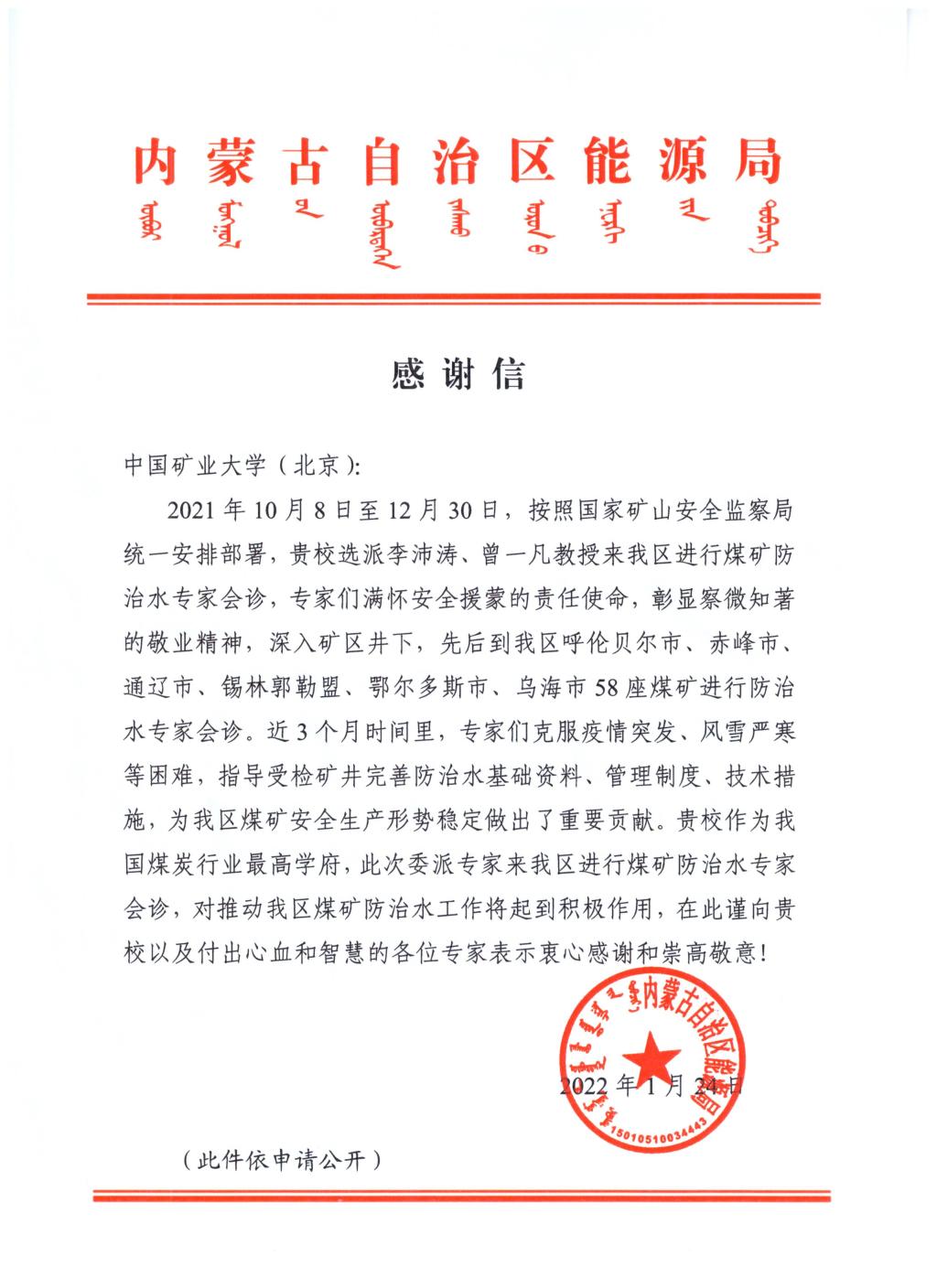 近日,内蒙古自治区能源局给我校发来感谢信,感谢我校及国家煤矿水害防治工程技术研究中心李沛涛教授级高工和曾一凡副教授在内蒙古自治区煤矿防治水专家会诊工作中做出的贡献。