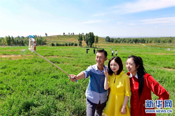 景致宜人的绿色矿山:2021年9月14日,游客在位于伊金霍洛旗纳林陶亥镇的
