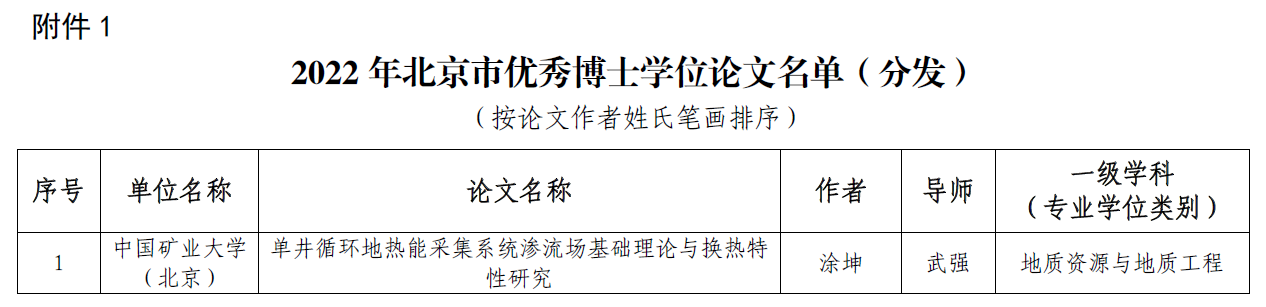 2022年12月14日,北京市教育委员会、北京市学位委员会公布了2022年北京市优秀博士学位论文名单。国家煤矿水害防治工程技术研究中心涂坤教师的博士学位论文《单井循环地热能采集系统渗流场基础理论与换热特性研究》获评2022年北京市优秀博士学位论文,是中国矿业大学(北京)唯一入选者,指导教师为中国工程院院士、中国矿业大学(北京)教授、国家煤矿水害防治工程技术研究中心主任武强。