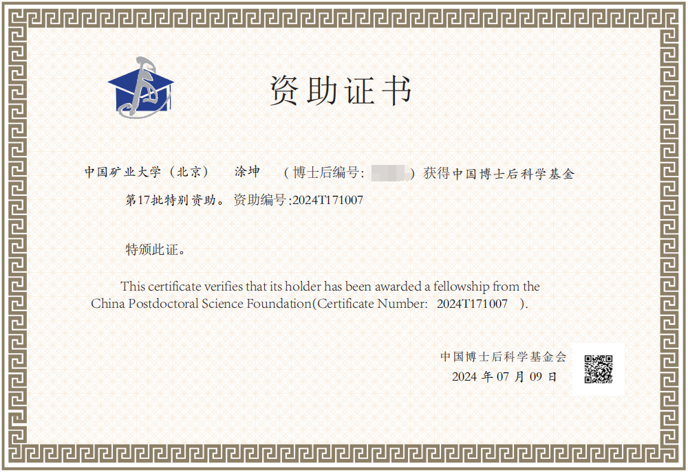 近日,中国博士后科学基金会公布了2024年度中国博士后科学基金第17批特别资助获资助人员名单,全国共1198人获得资助。国家煤矿水害防治工程技术研究中心副教授、博士后涂坤(合作导师武强院士)获2024年度中国博士后科学基金第17批特别资助,所申报项目一级学科为地质资源与地质工程,该学科本年度全国仅有12人入选。