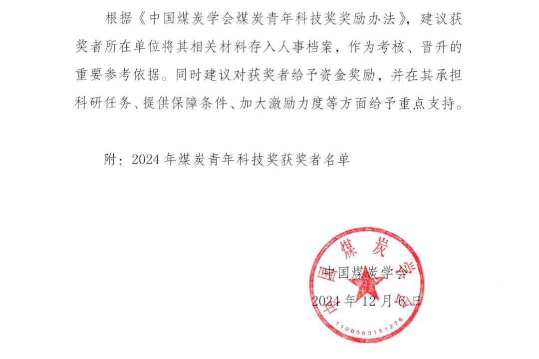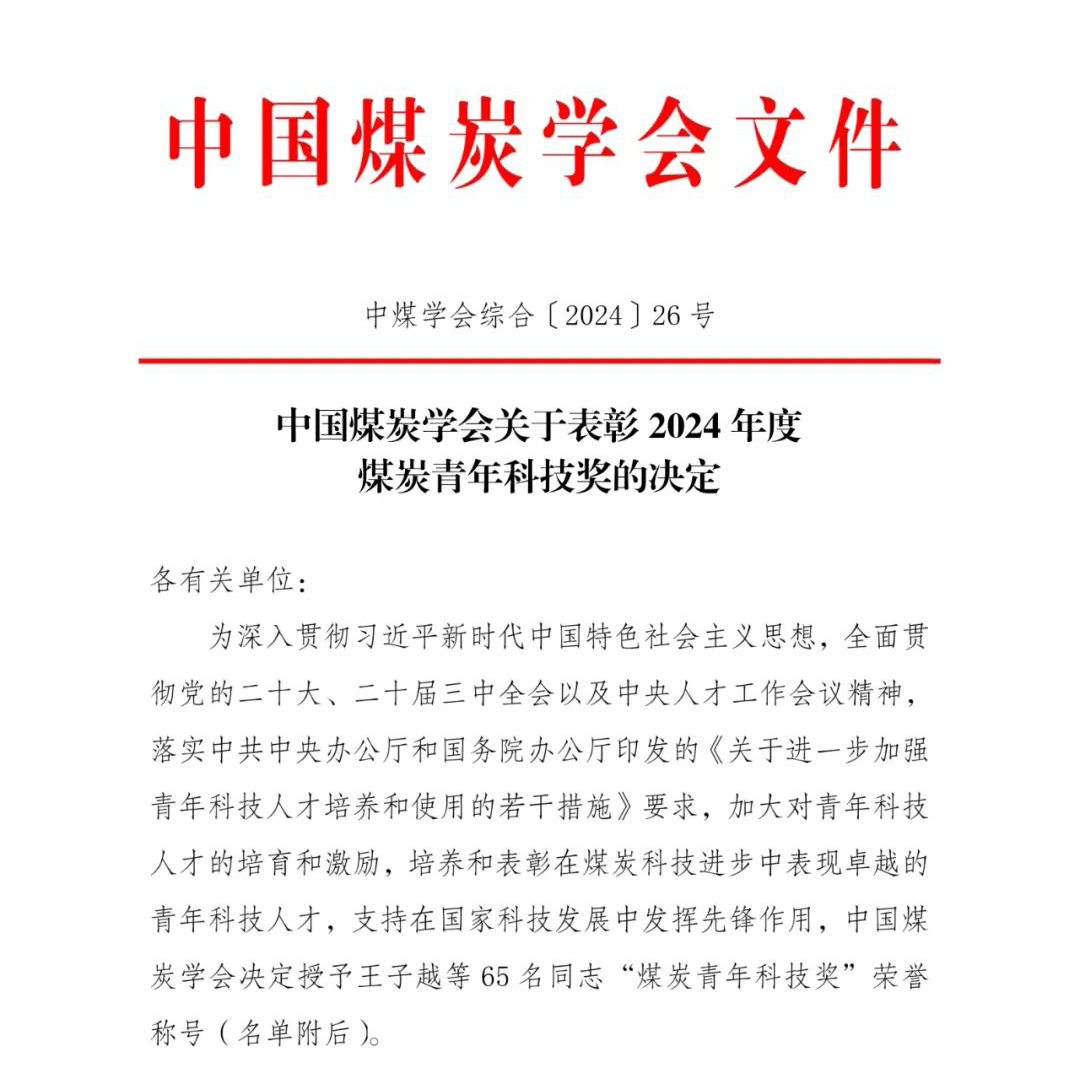 煤炭青年科技奖由中国煤炭学会1990年设立,经国家科学技术奖励工作办公室批准登记,旨在激励在煤炭科技进步中作出突出贡献的优秀青年,弘扬学术创新精神,更好地发挥行业学科青年骨干科技攻关模范带头作用。本次全国共有65名同志被授予2024年度煤炭青年科技奖。