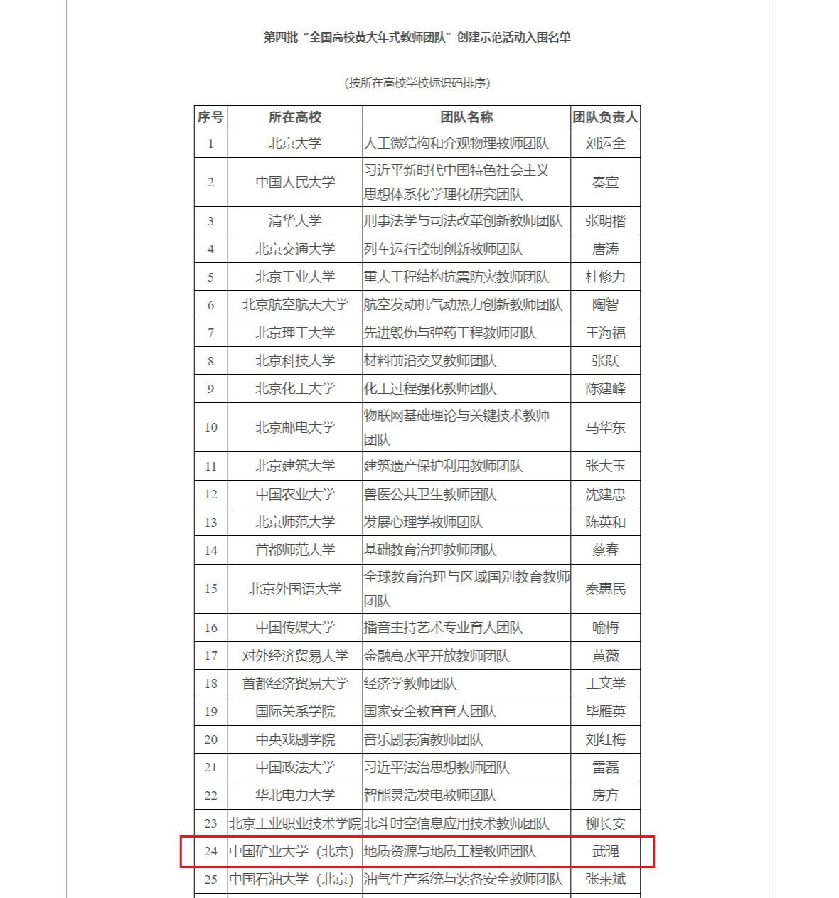 近日,教育部发布了第四批“全国高校黄大年式教师团队”创建示范活动入围名单,中国矿业大学(北京)武强院士“地质资源与地质工程教师团队”团队入围。