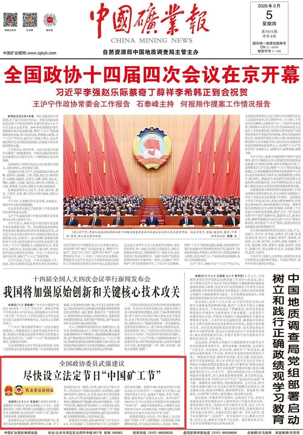 武强委员介绍说,国际通用的矿工日为12月6日,旨在致敬矿工在高危环境下为工业资源开发作出的贡献。我国自2011年起由中国矿业联合会设立行业性节日——全国矿业工作者日,原为每年的2月17日,涵盖矿产勘查、开采、科技、管理、服务等全产业链从业人员。该节日源于1950年2月17日毛泽东为我国留苏学生题词的“开发矿业”。2024年经权威考证,日期更正为每年的12月31日;自2025年起,中国矿业联合会将每年的12月26日至31日设为“矿业周”。